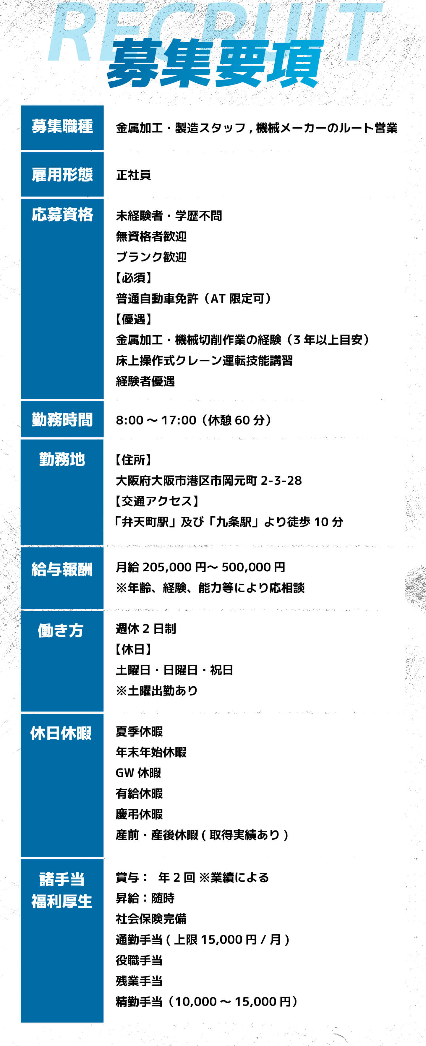 | 事業内容 | 大型金属精密切削機械加工全般 マシニングセンター加工 横中ぐり盤加工 竪中ぐり盤加工 ラジアルボール盤加工 フライス加工 不動産管理業務 |